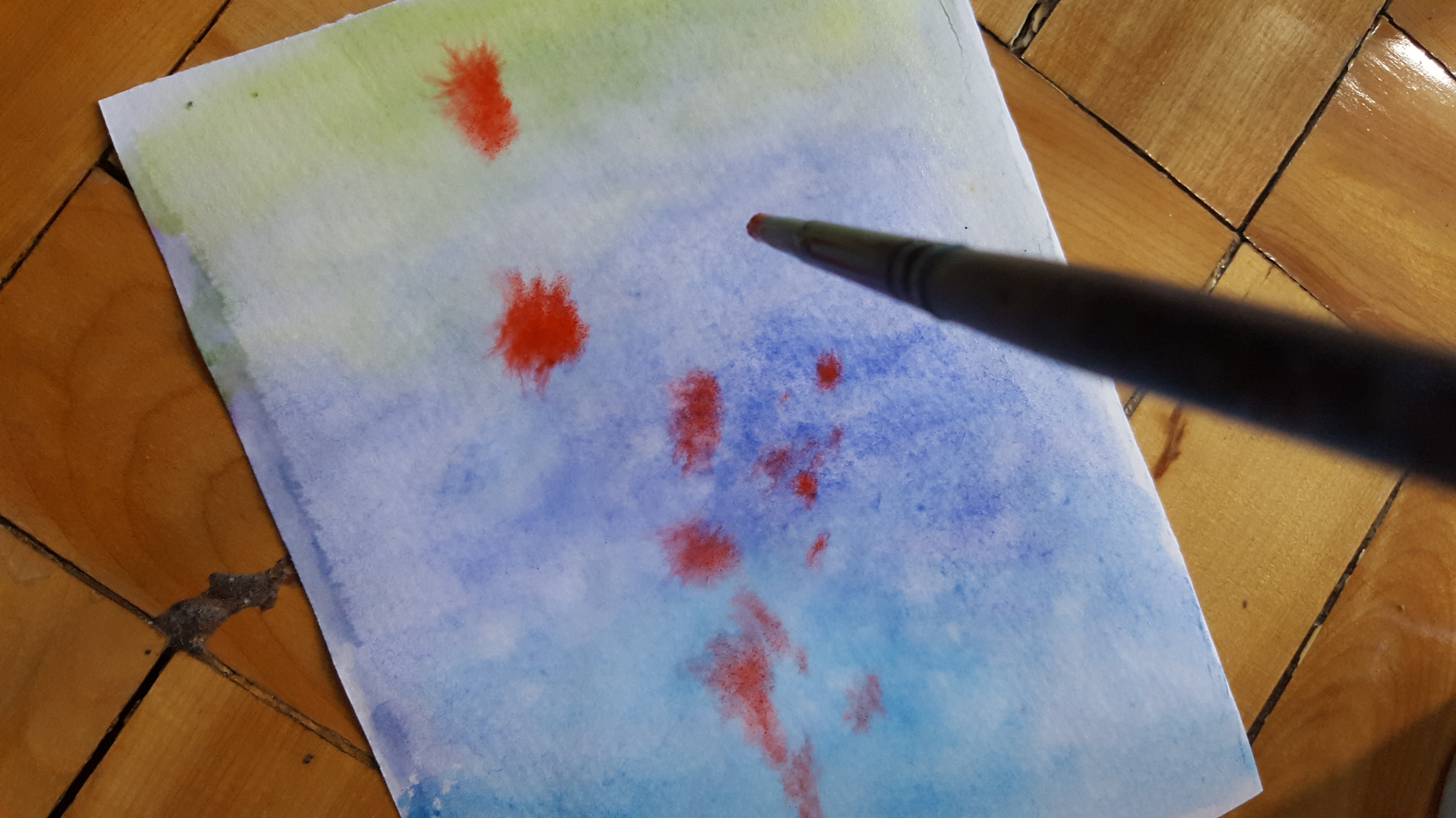 Talk about solids – the paper and the brush. Alone, do they affect one another? Not unless you’re really violent. They can touch each other, but they don’t change each other. They just bump. But liquids like water are different. Soak the paper in water and let students experiment with adding different colors and seeing how they run together and blend. Even without the help of a brush, if there’s enough water on the page, a single drop will still move and spread on its own. In the picture above, I’m about to add another drop of red.
