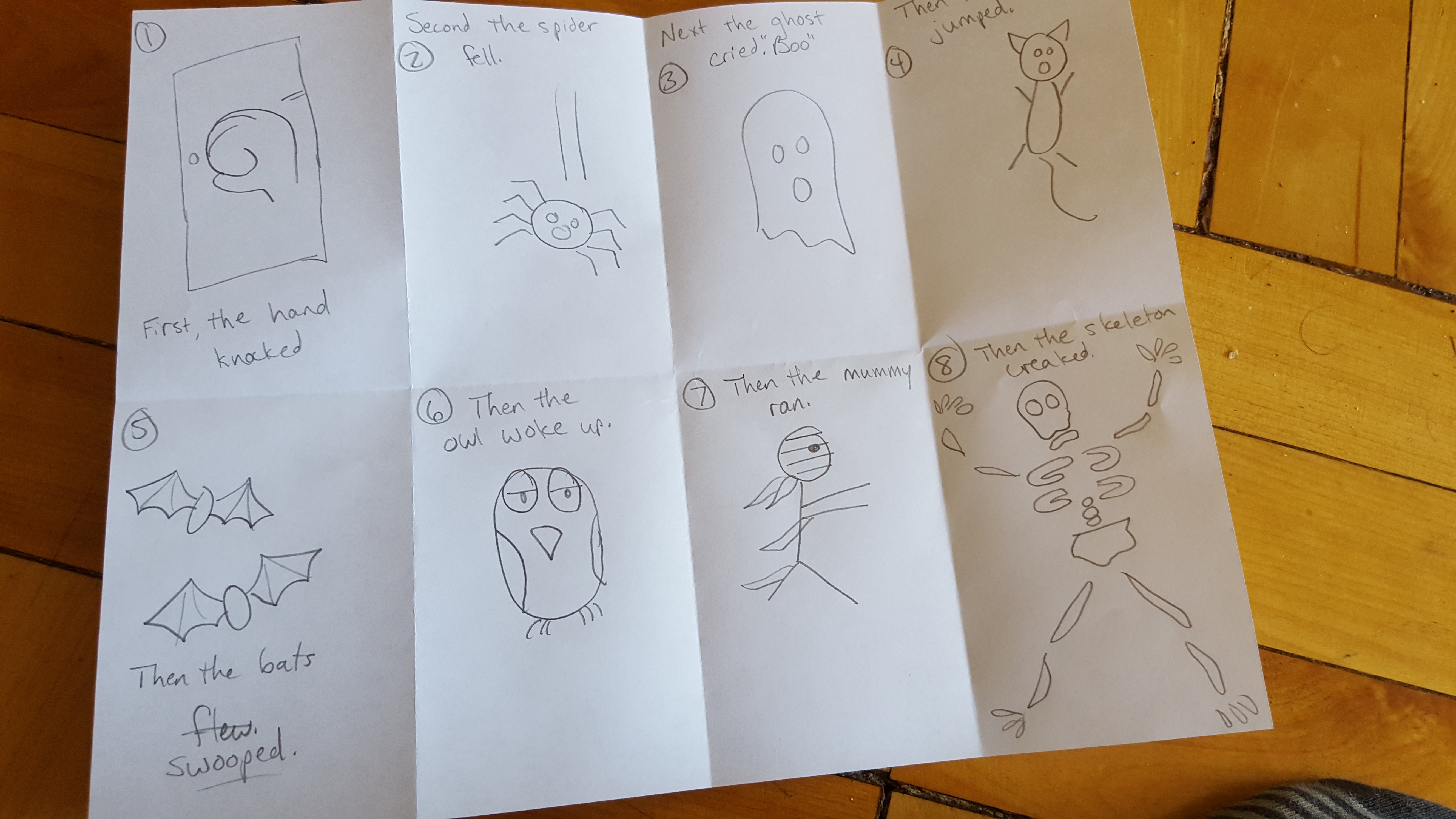 Then we read-aloud the book again, this time having the students do the motions corresponding to each character. We may do that once or more than once, depending on the group. Last, we put aside the story entirely, and the students storyboard the sequence from memory.