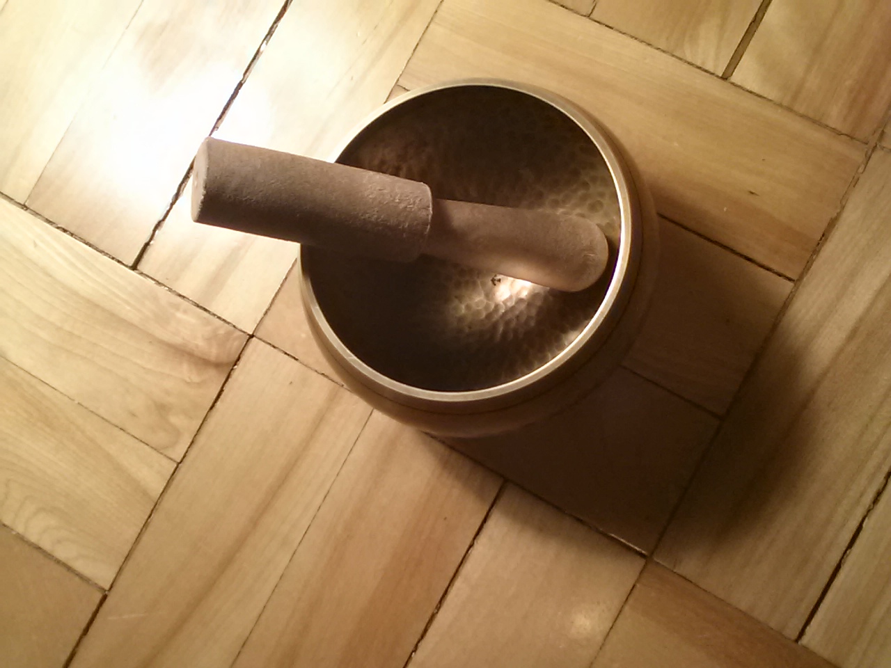 I ask them to sit with their back straight and relaxed, palms relaxed, either palm up or palm down on their knees, their choice, and to close their eyes. Then I ask them to listen to the sound of their breathing, and then the sound of my bowl.